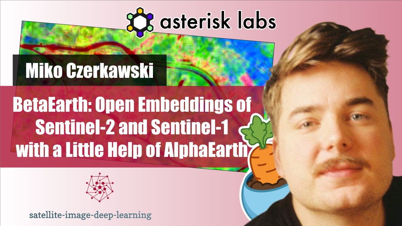 In this episode I sat down with Mikolaj (Miko) Czerkawski from Asterisk Labs to explore BetaEarth, an experimental open-source emulator trained on AlphaEarth Foundations' public embedding archive. AEF — released by Google and Google DeepMind as a global 10 m embedding product derived from a wide range of Earth-observation modalities — is what makes BetaEarth possible: its openness lets the community build lightweight independent emulators that approximate AEF's pixelwise outputs from standard Sentinel inputs, and use them to probe how much of a model's behaviour is captured in its public embeddings. Miko walks through BetaEarth's design — compact architectures based on SegFormer-B2 with separate per-modality encoders, and a shared DINOv3 backbone over 3-band spectral primitives — and the surprising finding that reasonably strong approximations can be achieved even from simple RGB inputs.
