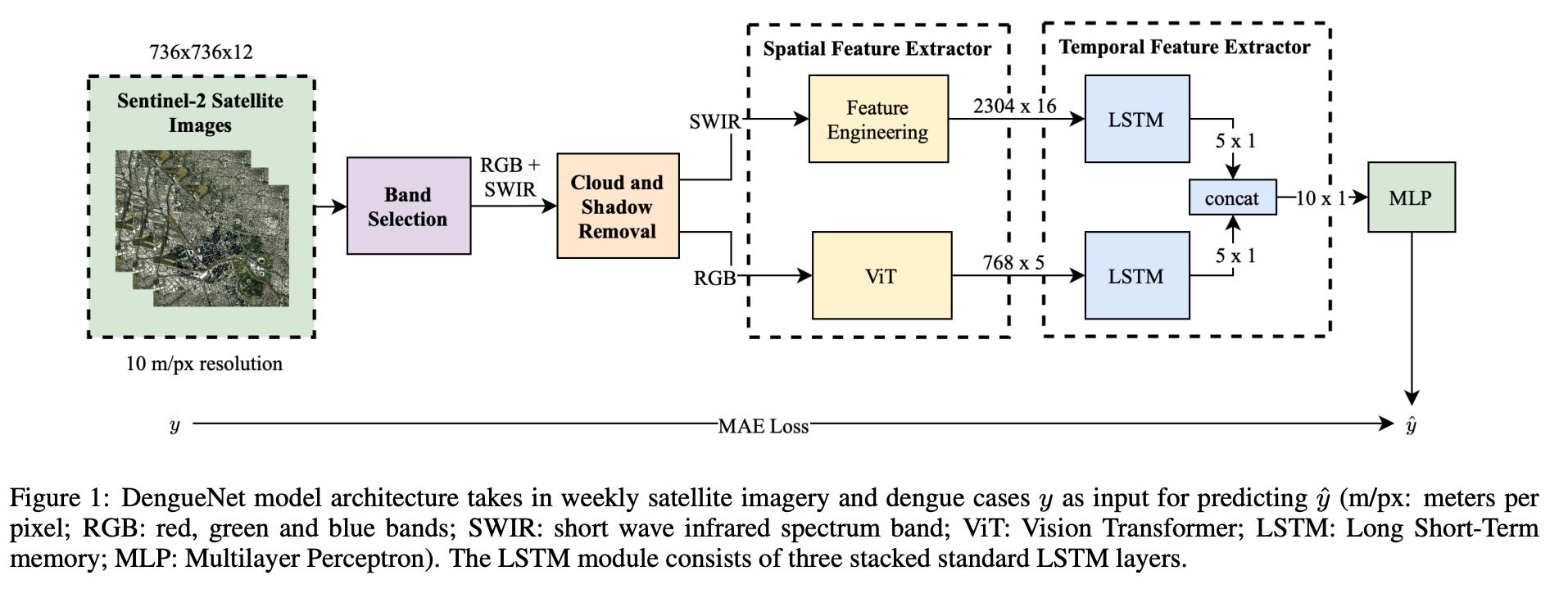 DengueNet combines Vision Transformer, Radiomics, and Long Short-term Memory to exploit spatial and temporal patterns in satellite image sequences. This enables dengue predictions on a weekly basis. The paper's promising results underline the feasibility and effectiveness of using satellite imagery for disease prediction. The versatility of this approach holds potential for application in a broader spectrum of vector-borne diseases, as well as in diverse fields that benefit from precise environmental monitoring.