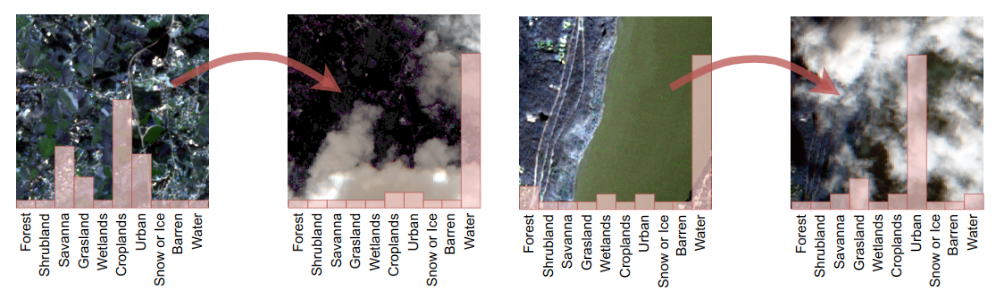 This first discovery is the paper ‘Explaining the Effects of Clouds on Remote Sensing Scene Classification’ published in the IEEE Journal of Selected Topics in Applied Earth Observations and Remote Sensing. This paper explores the effects of haze and cloud coverage on a scene classification task, and the image above shows how the predictions of a classifier can be altered due to the presence of cloud. Clouds considerably alter the spectral characteristics of data and make individual land cover types less separable from one another. The paper highlights how classifiers trained on cloud-free image data often fail once they encounter real world imagery containing clouds. Based on a multistage analysis, including explainability approaches applied to the predictions, the paper illustrates four different types of effects that clouds have on scene prediction. Given that clouds cover over 50% of the planet's surface at any point, it is important that their effects be understood on ML applications.